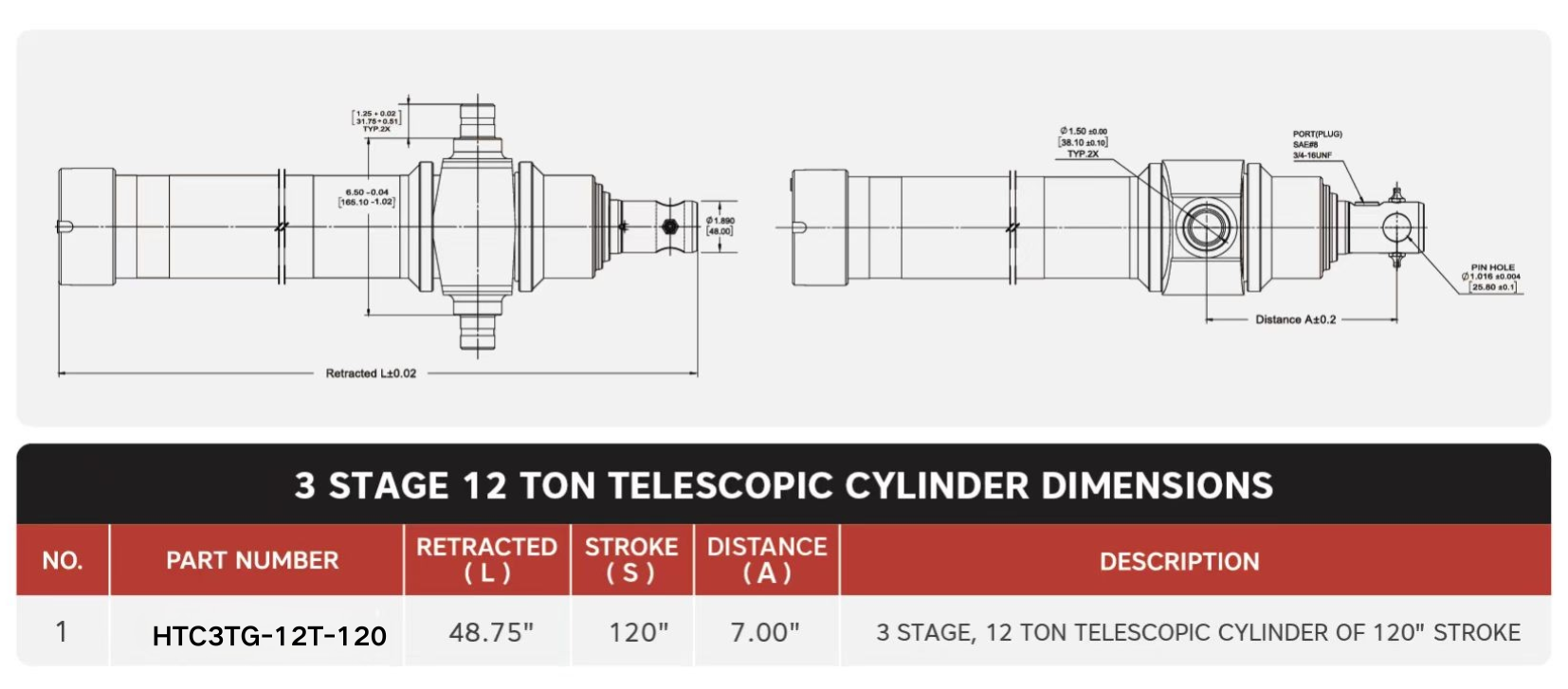 "HTC3TG-12T-120", 3 स्टेज, 12 टन 120" स्ट्रोक टेलीस्कोपिक सिलेंडर