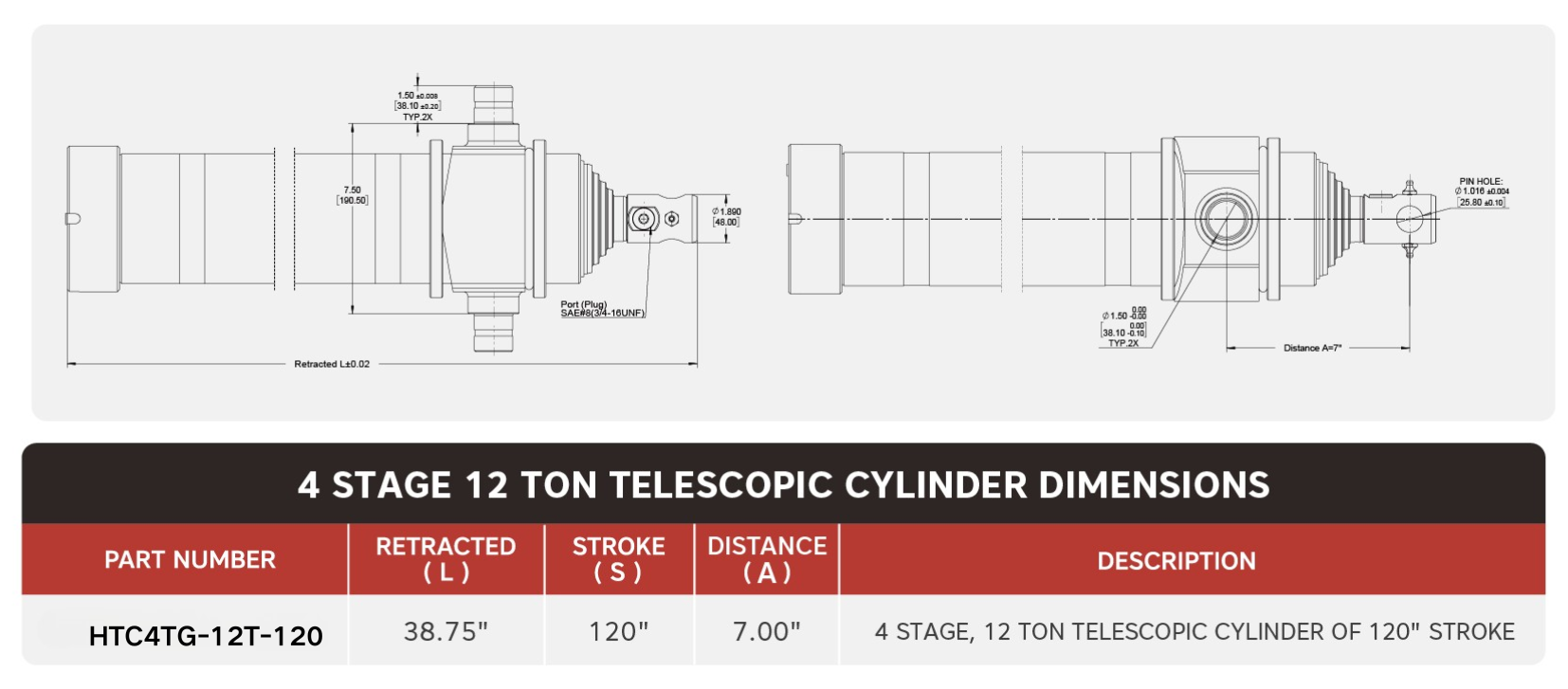 "HTC4TG-12T-120", 4 स्टेज, 12 टन 120" स्ट्रोक टेलीस्कोपिक सिलेंडर