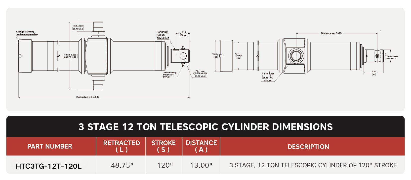 "HTC3TG-12T-120L", 3 चरण, 12 टन 120" स्ट्रोक 13" ट्रुनियन दूरी टेलीस्कोपिक सिलेंडर
