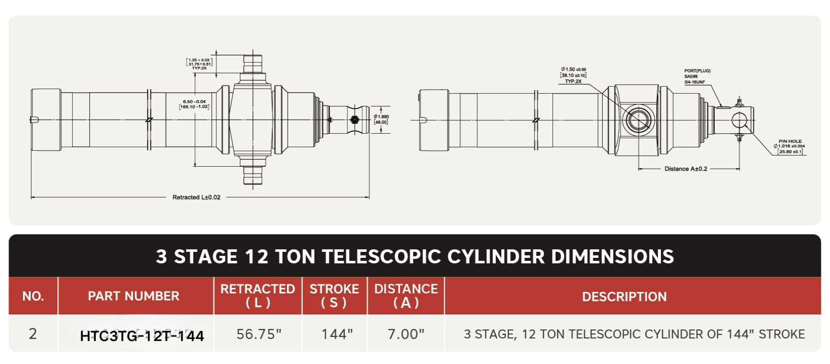 "HTC3TG-12T-144", 3 स्टेज, 12 टन 144" स्ट्रोक टेलीस्कोपिक सिलेंडर