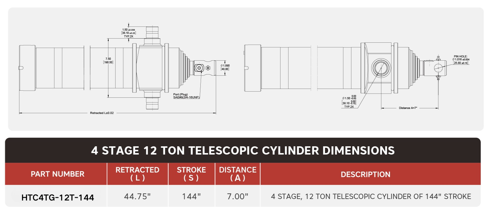 "HTC4TG-12T-144", 4 चरण, 144 का 12 टन" स्ट्रोक टेलीस्कोपिक सिलेंडर