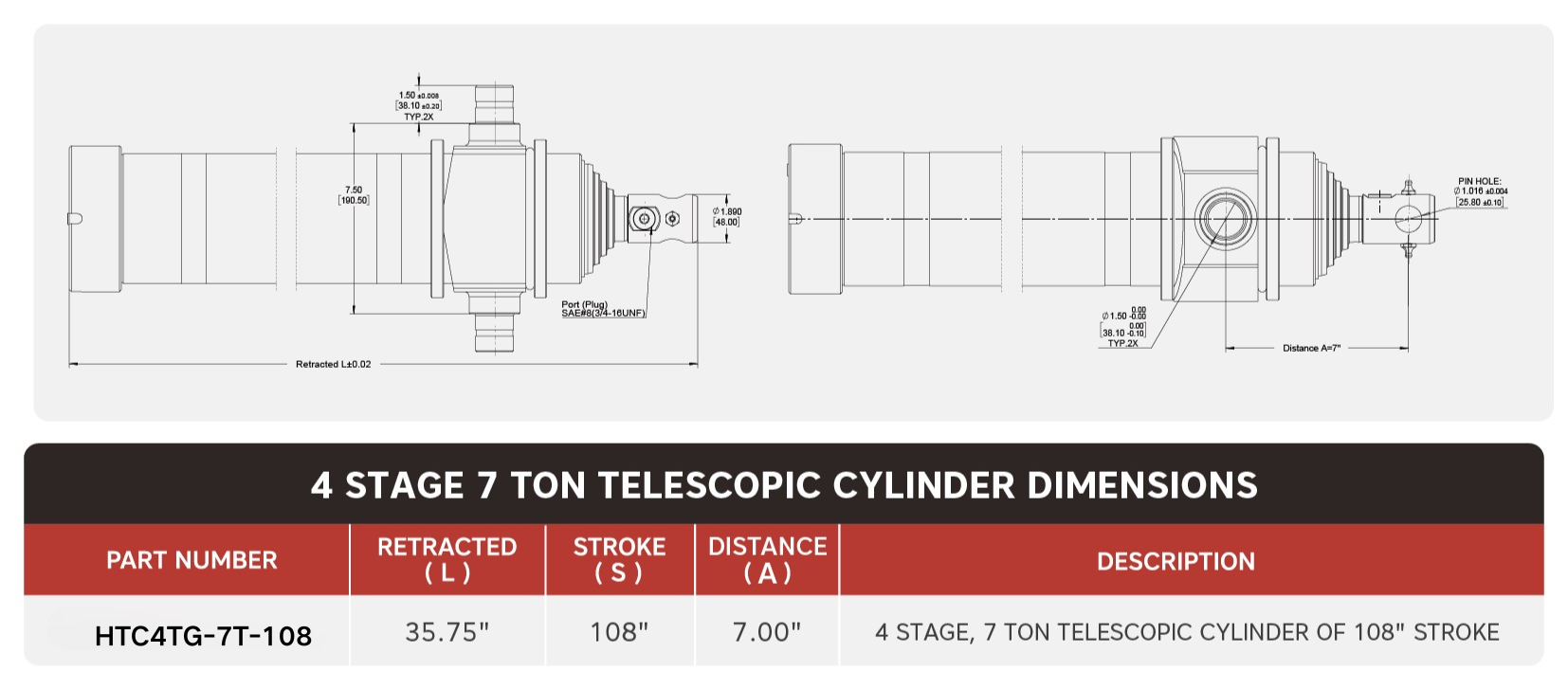 "HTC4TG-7T-108", 4 स्टेज, 7 टन 108" स्ट्रोक टेलीस्कोपिक सिलेंडर